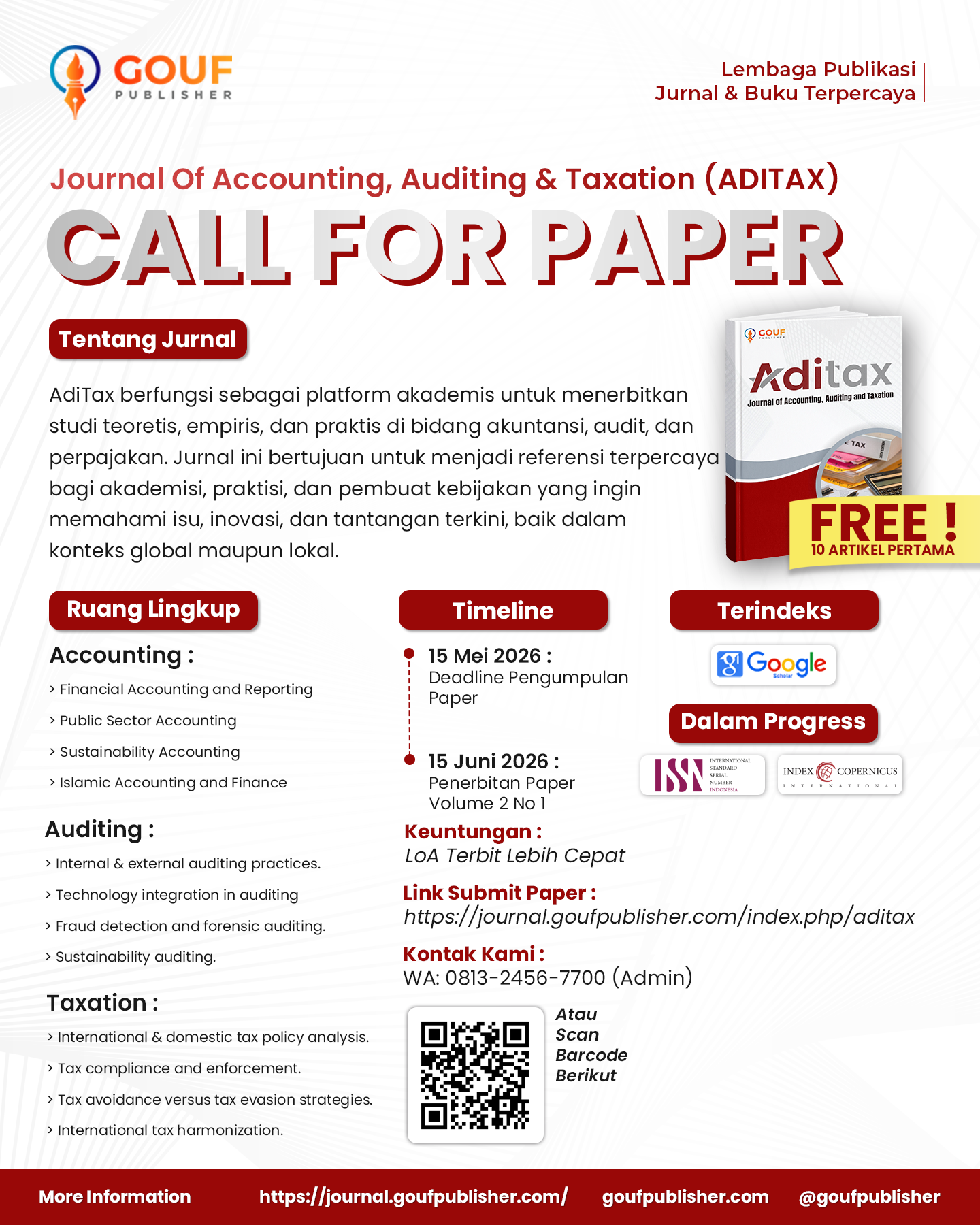 AdiTax serves as an academic platform for publishing theoretical, empirical, and practical studies in accounting, auditing, and taxation. The journal aims to be a reliable reference for academics, practitioners, and policymakers who seek to understand current issues, innovations, and challenges in both global and local contexts.Journal Title : Journal of Accounting, Auditing and Taxation Initials : ADITAX Frequency : E-ISSN : Chief Editor : DOI Prefix : Publisher : INSPIRA JURNAL INDONESIA in collaboration with Galeri Investasi FISIP Universitas Halu Oleo Accreditation :